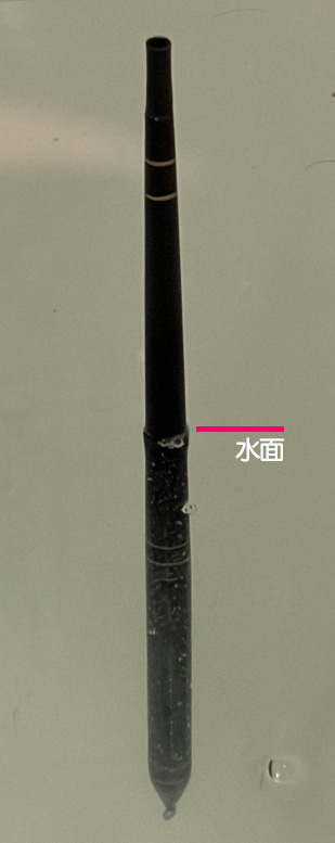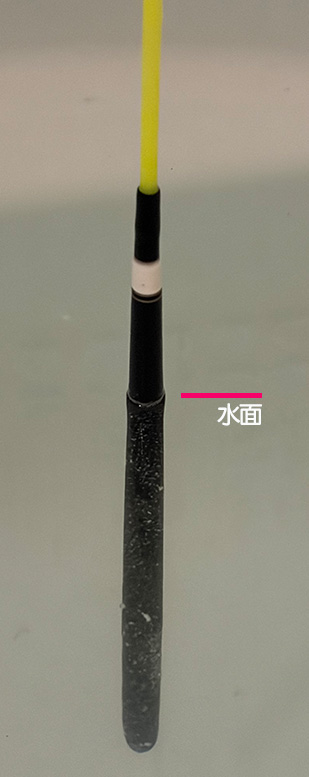 0号の短めのウキが欲しくて購入したものですが、こうして実験してみると、水面が本体のハカマより下にあります。